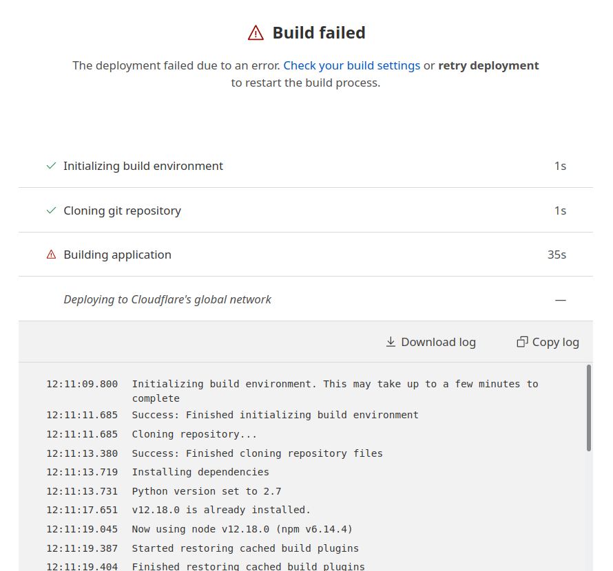 If you have followed all the previous steps, you'll end up with a Build failed error screen.