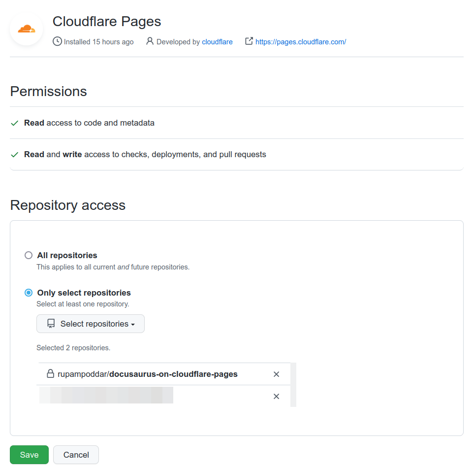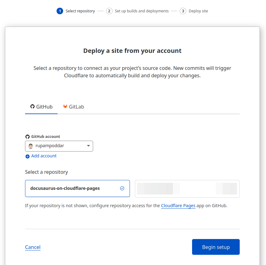You'll be redirected back to Cloudflare Pages. Select the Github repository and click on Begin Setup.