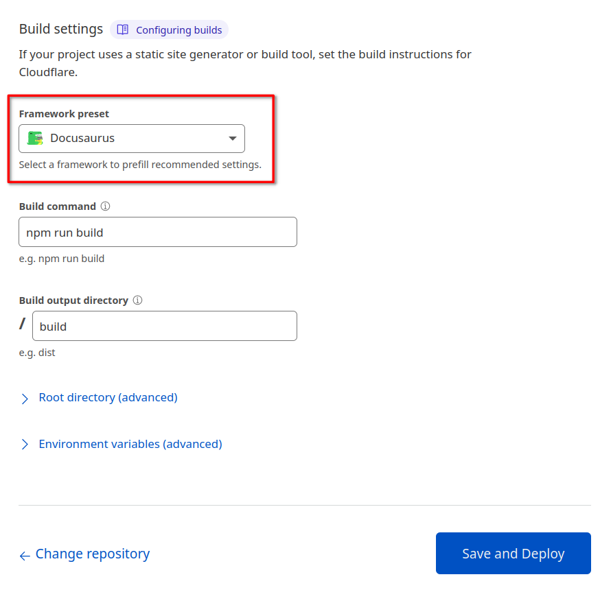 Under Build settings, change the Framework preset to Docusaurus. Click on Save and Deploy.
